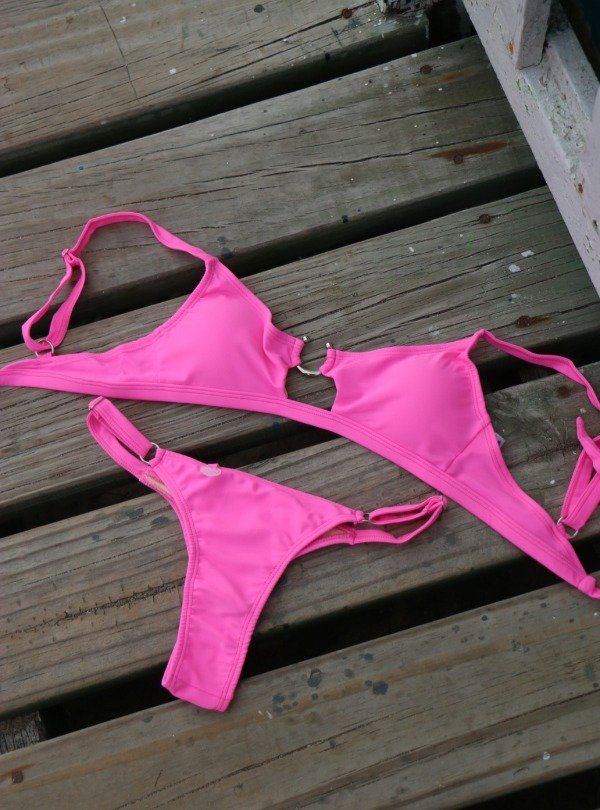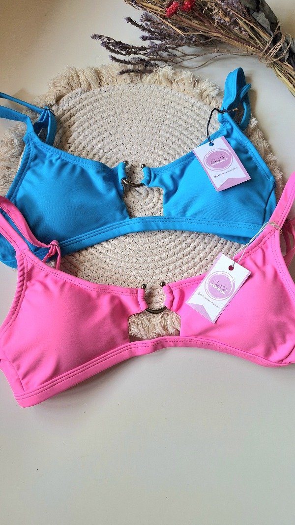 Bikini con corpiño tipo top con detalle de recorte y argollita metalica en el escote.
