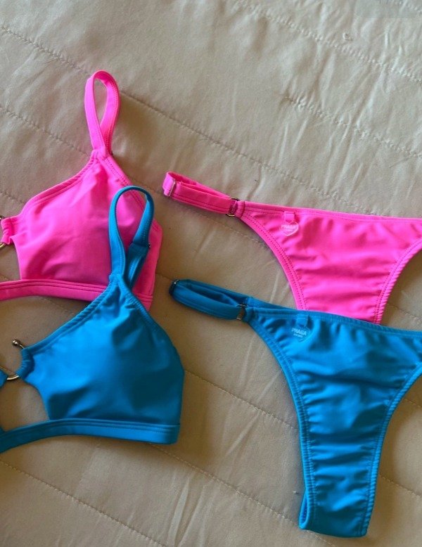 Bikini con corpiño tipo top con detalle de recorte y agollita metalica en el escote
