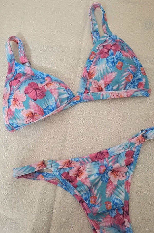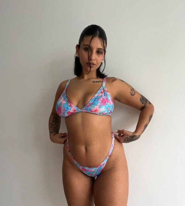 Triangulo fijo con breteles regulables, espalda para atar y tazas desmontables. Bombacha colaless regulable ( lycra premiun)